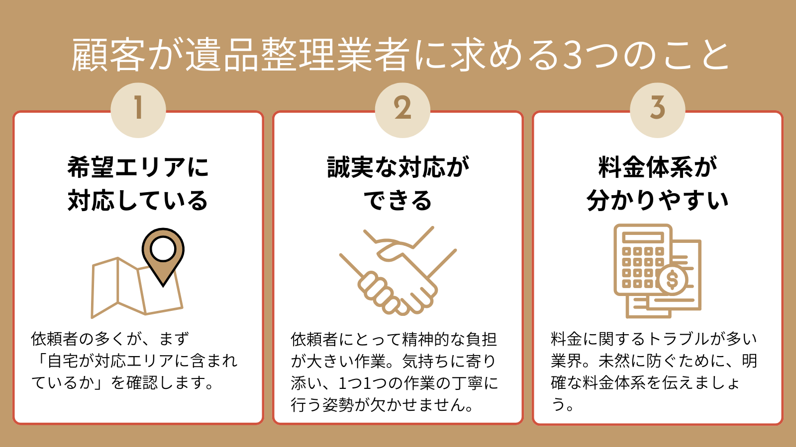 ここでは、集客を考える前に知っておきたい、顧客が遺品整理業者に求める3つの基本要素をご紹介します。