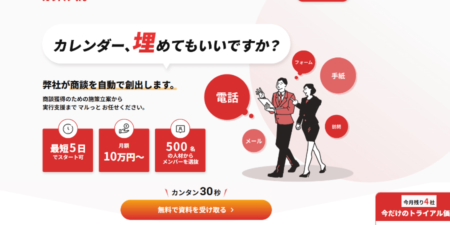 月額10万円から電話営業・問い合わせフォーム営業・メール営業まで、幅広い業務を依頼できる定額制の営業支援サービスです。