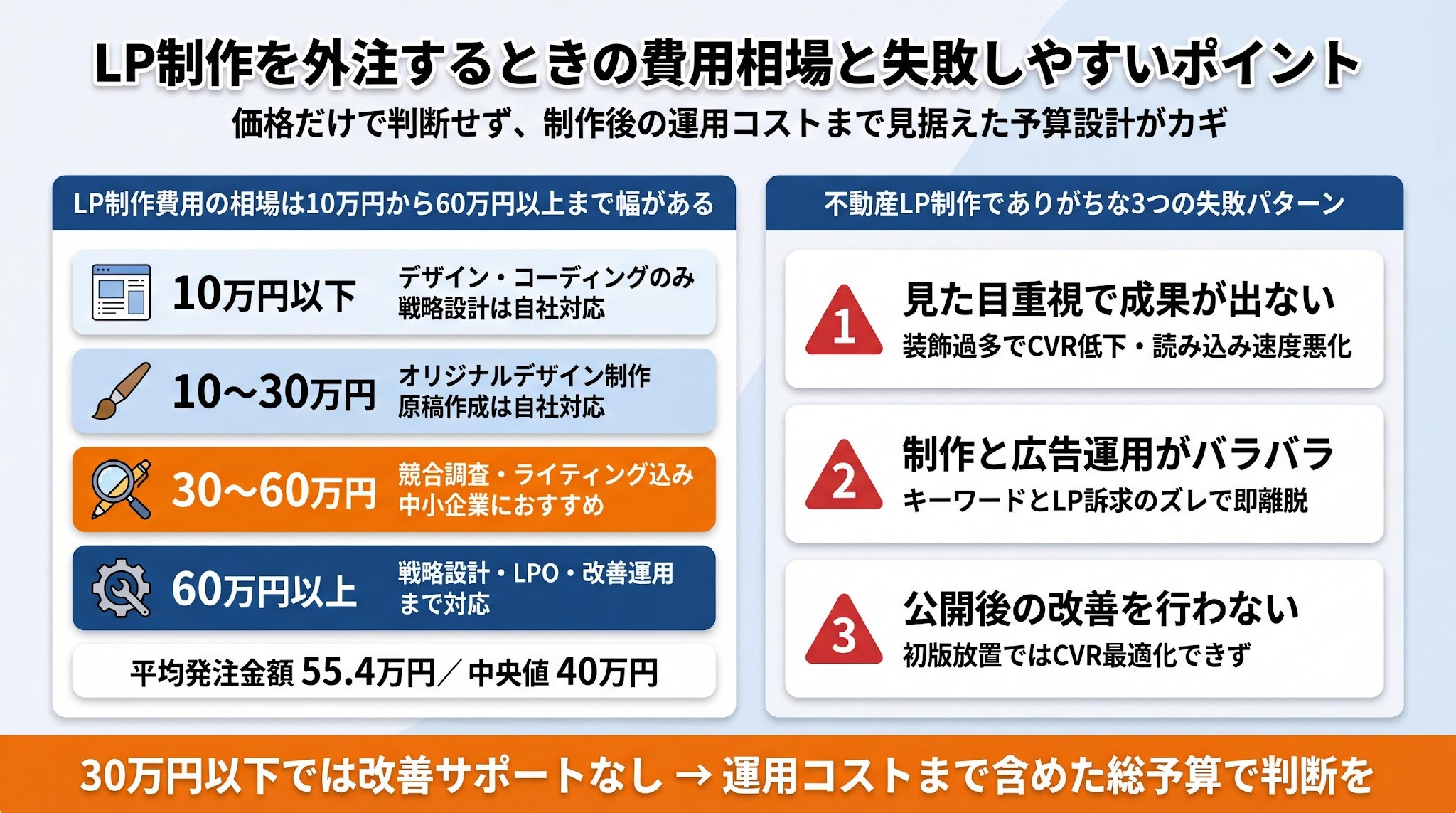- LP制作の費用相場は30~60万円が中心帯だが、制作後の運用・改善コストを含めた総予算で判断することが重要