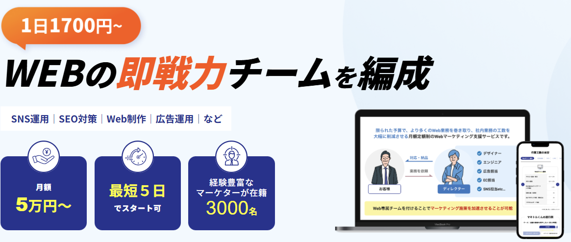 月額固定でLP制作・広告運用・SNS運用・SEO対策までカバーできるサービスを活用すれば、外注先の一元管理と予算の固定化を同時に実現可能です。