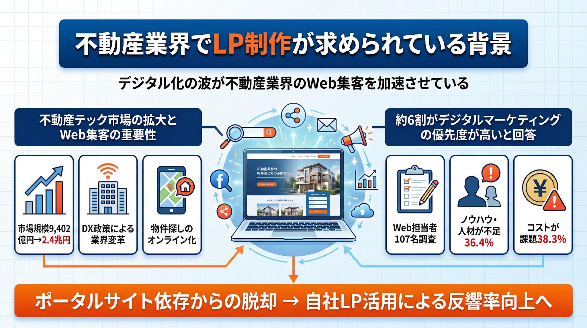 - 不動産テック市場は2030年度に約2.4兆円規模へ拡大が予測されており、LP制作を含むWebマーケティング施策は業界の成長戦略に不可欠