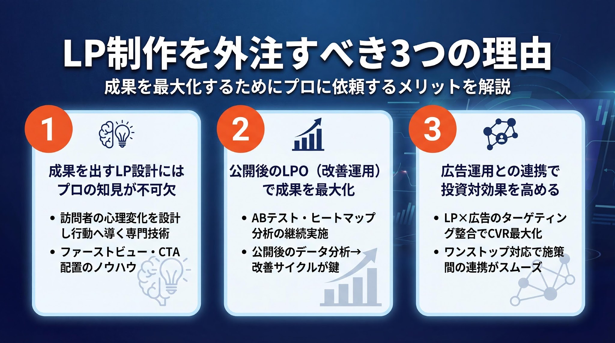 LP制作を社内で完結させるか外注するか、判断に迷う企業は多いものです。しかし成果を最大化するなら、外注には明確なメリットがあります。