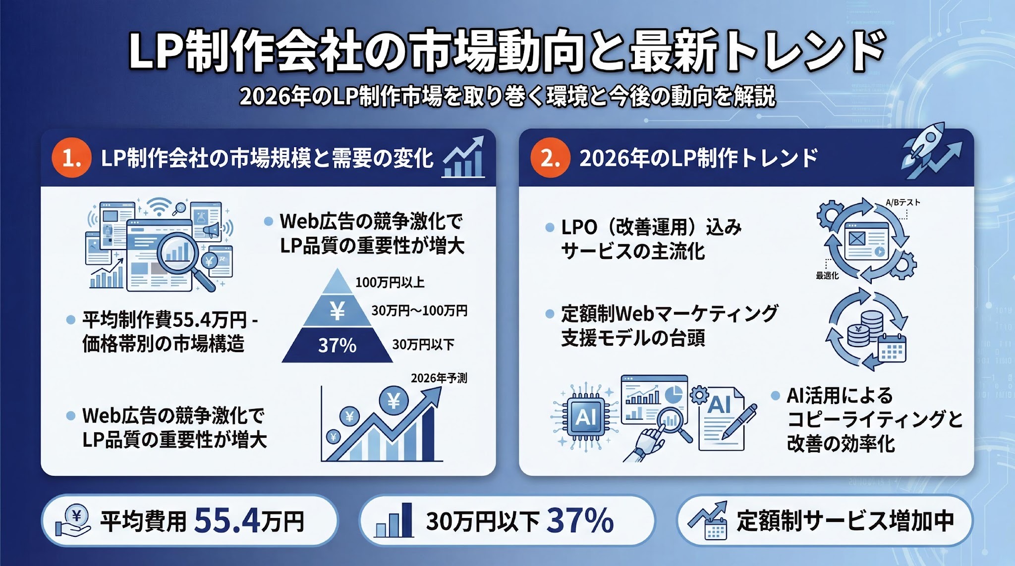 2026年のLP制作市場では、いくつかの顕著なトレンドが見られます。まず、「制作して終わり」ではなく「公開後の改善運用(LPO)込み」の一気通貫サービスが主流化しています。