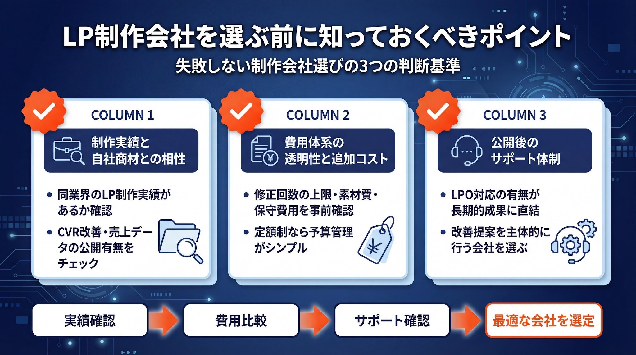 LP制作会社を選ぶ際は、費用だけでなく「制作実績」「LPO対応」「広告運用との連携」の3つを軸に比較することが重要です。