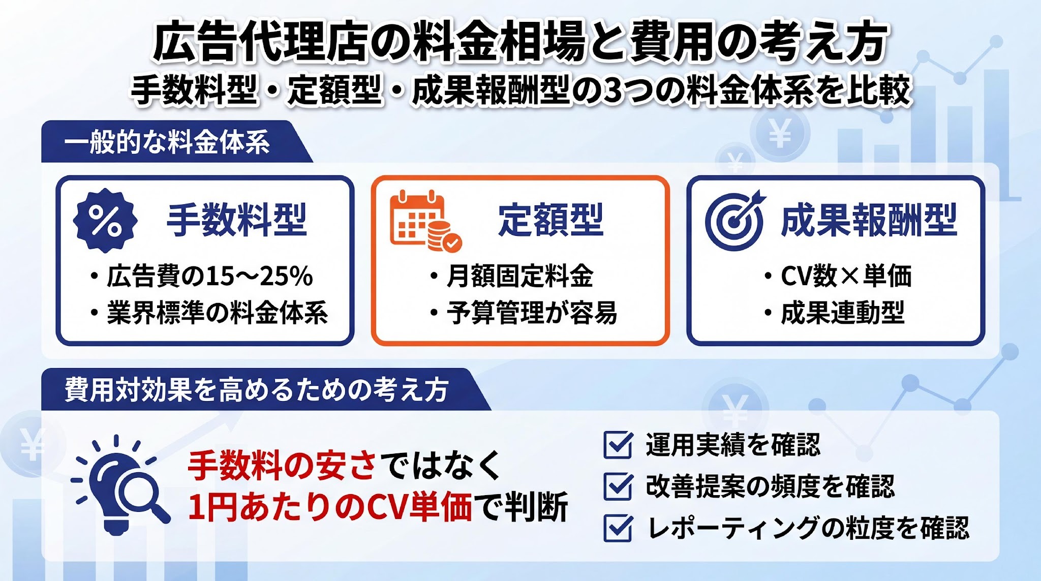 | 定額型 | 月額固定料金 | 予算管理が容易 | 広告費が少額だと割高感も |