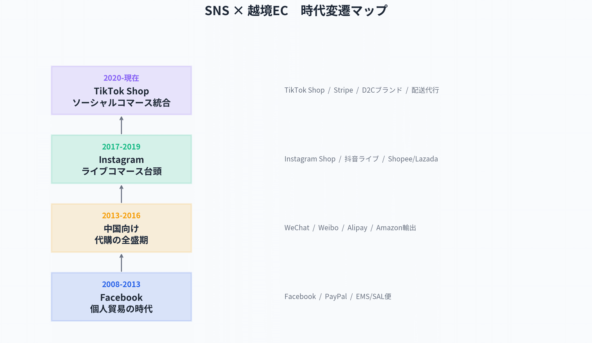 その一方で、2000年代後半から2010年代前半にかけて、もう一つ別の流れが育っていました。SNSを起点に広がっていったソーシャル越境ECです。
