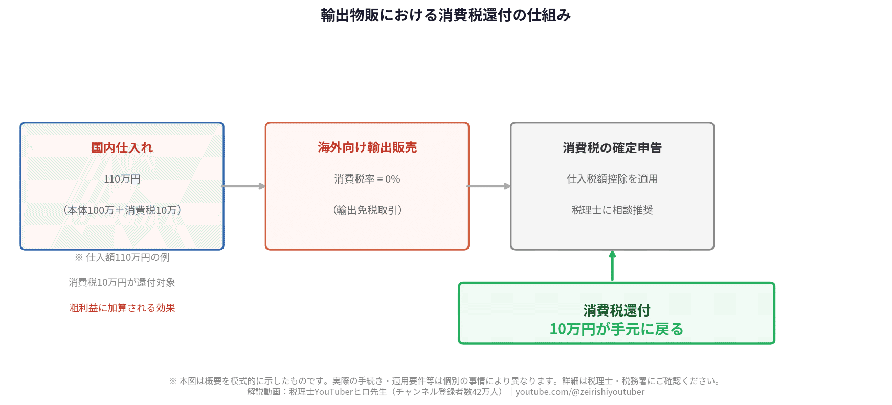 輸出物販の魅力は何かと聞かれたら、ここを挙げる人は多いです。かなりざっくり言えば、エンドユーザーが日本在住ではない輸出取引では、仕入れにかかった消費税分が申告によって戻ってくる構造です。