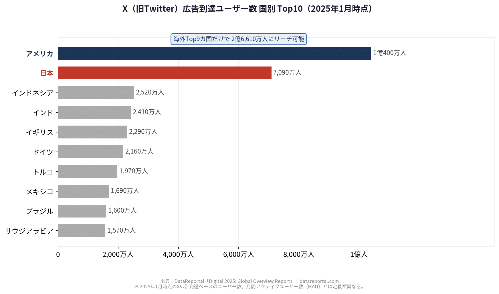 感覚的には「世界に届く媒体」ですが、数字で見ると、その輪郭がもう少しはっきりします。Xの広告到達ベースで見た2025年1月時点の国別ユーザー数トップ10は以下の通り。