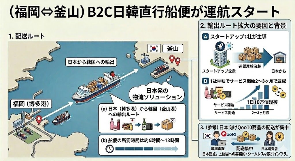 2023年には、福岡港から釜山港へ初めてBtoC貨物の直行船便が運行開始した。スタートアップ企業が参入し、まもなく1日10万個を超える規模の物量になった。そのほとんどがQoo10受注からの発送でした。